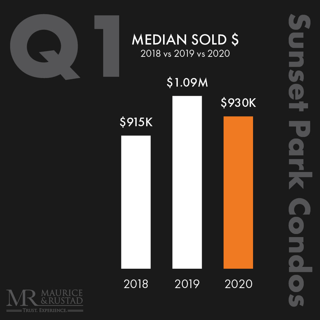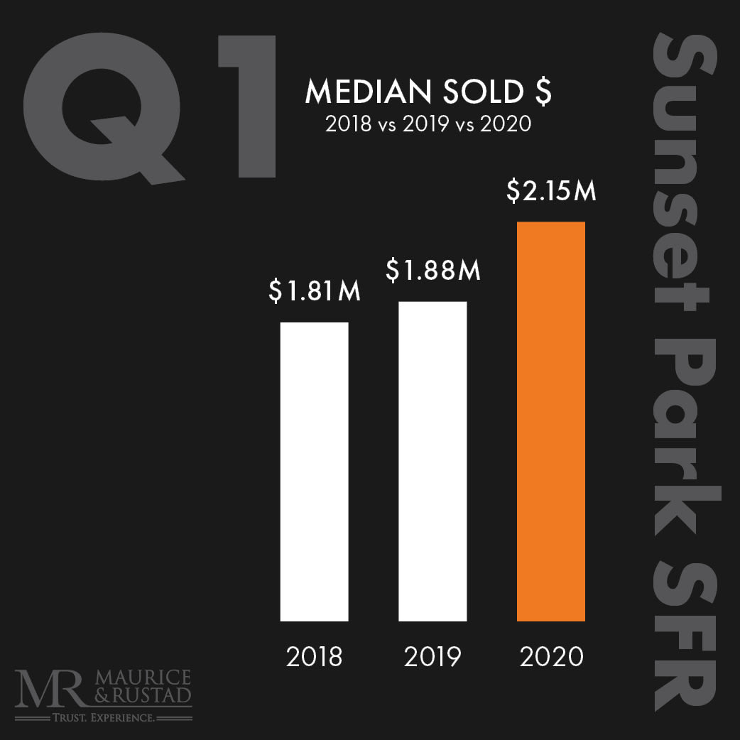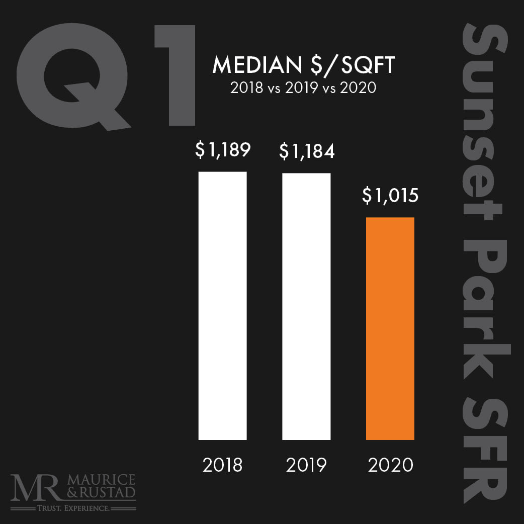 The Sunset Park real estate market had a strong start in 2020: 18 Single Family Homes sold in the first three months and typically, these homes sold 40% faster than in 2019. Even though the sold price per square foot dipped (based on a number of larger homes selling than in the prior year), the median sold price increased 14% in 2020, signaling that the year began with a high level of optimism. Since homes typically close 30-60 days after a purchase contract is signed, we expect a slowdown for next quarter, as many sellers have delayed listing their homes and buyers are generally waiting for markets to stabilize as the pandemic comes under control.