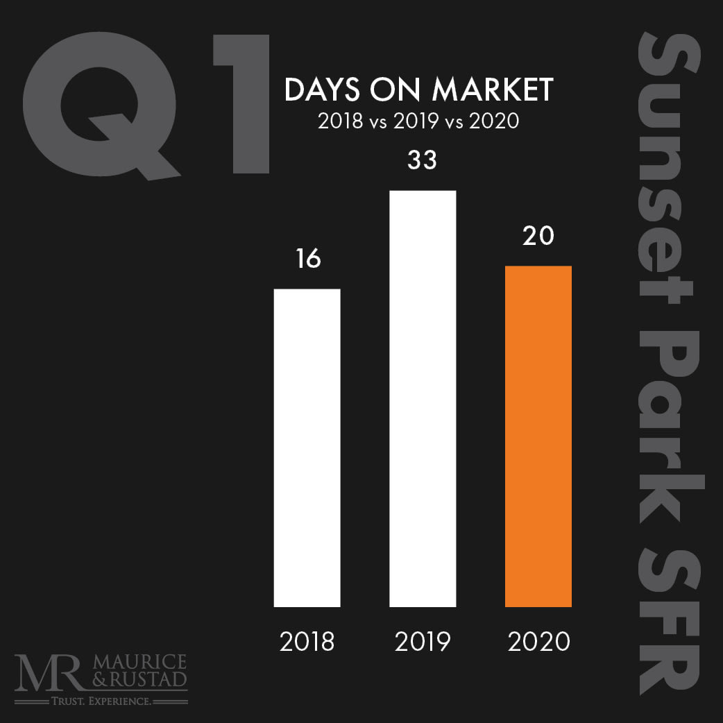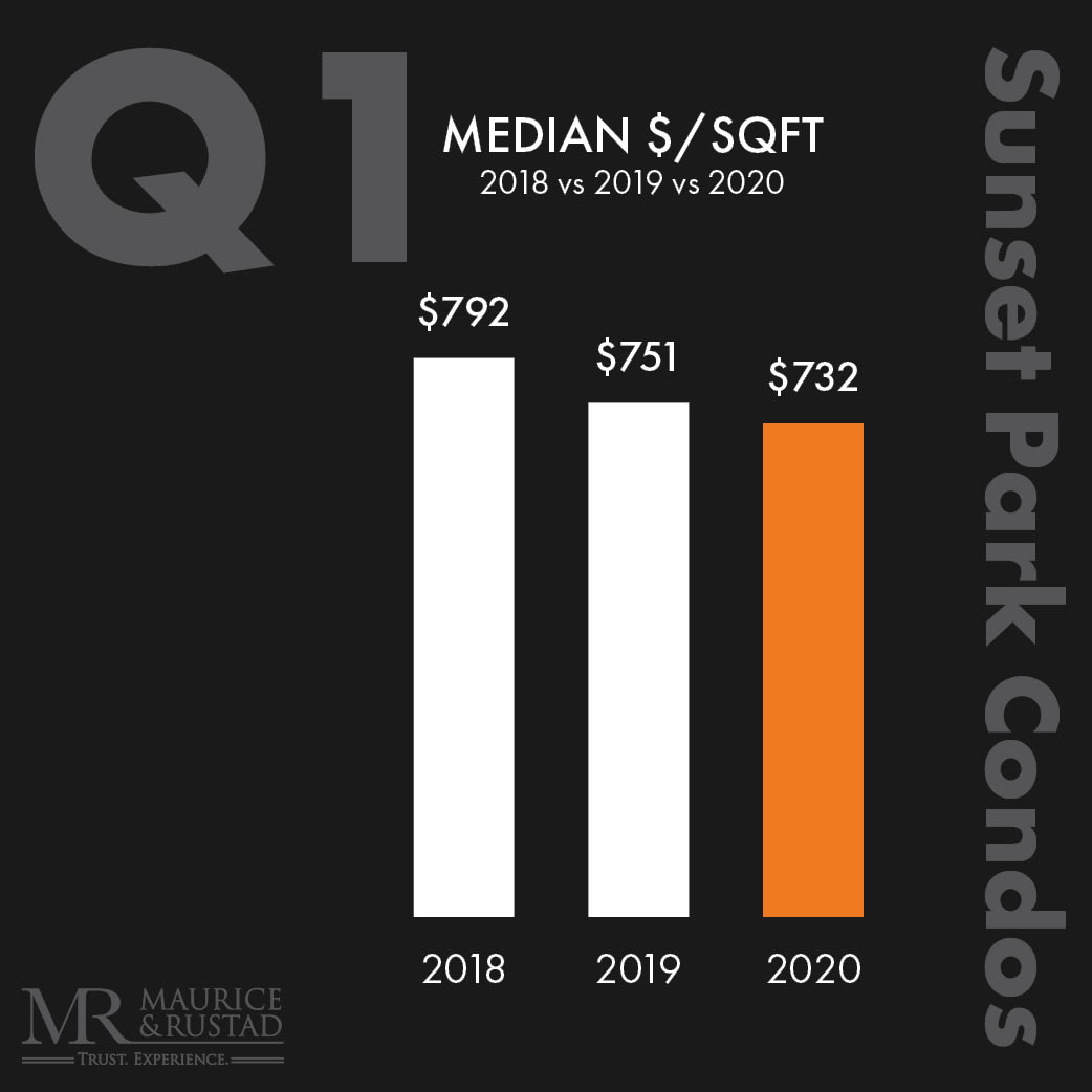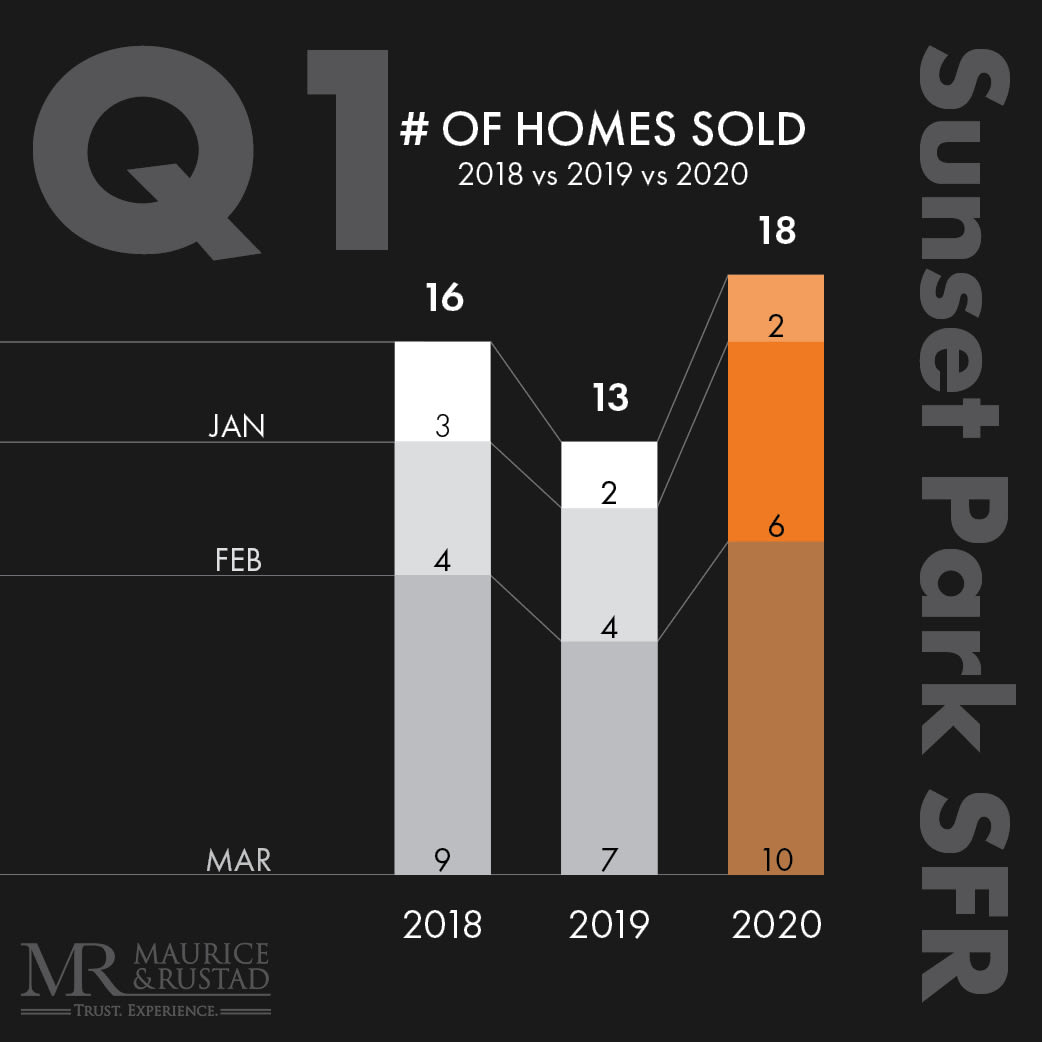 The Sunset Park real estate market had a strong start in 2020: 18 Single Family Homes sold in the first three months and typically, these homes sold 40% faster than in 2019. Even though the sold price per square foot dipped (based on a number of larger homes selling than in the prior year), the median sold price increased 14% in 2020, signaling that the year began with a high level of optimism. Since homes typically close 30-60 days after a purchase contract is signed, we expect a slowdown for next quarter, as many sellers have delayed listing their homes and buyers are generally waiting for markets to stabilize as the pandemic comes under control.